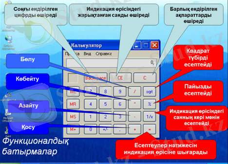 Оқушыларды плактқа жазылған калькулятордың негізгі батырмалары мен жалаушаларының тізімімен таныстырып, есептер шешуге өтемін.