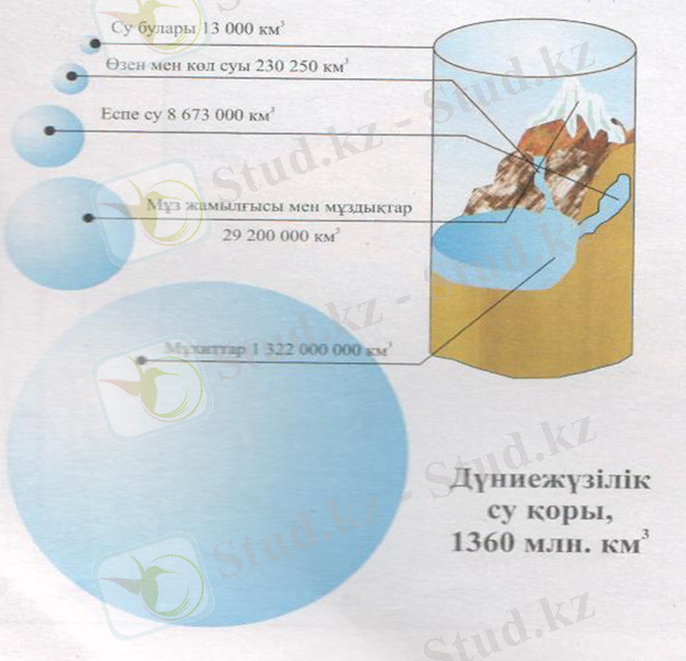 Дүние жүзіндегі жалпы су қоры-1360 млн. км 3 . Жер бетіндегі сулар - мұхит-тарда, өзен-көлдерде, мұздықтарда, жер астында, атмосферада кеңінен тарал-ған. Оны мына суреттен де көруге болады.